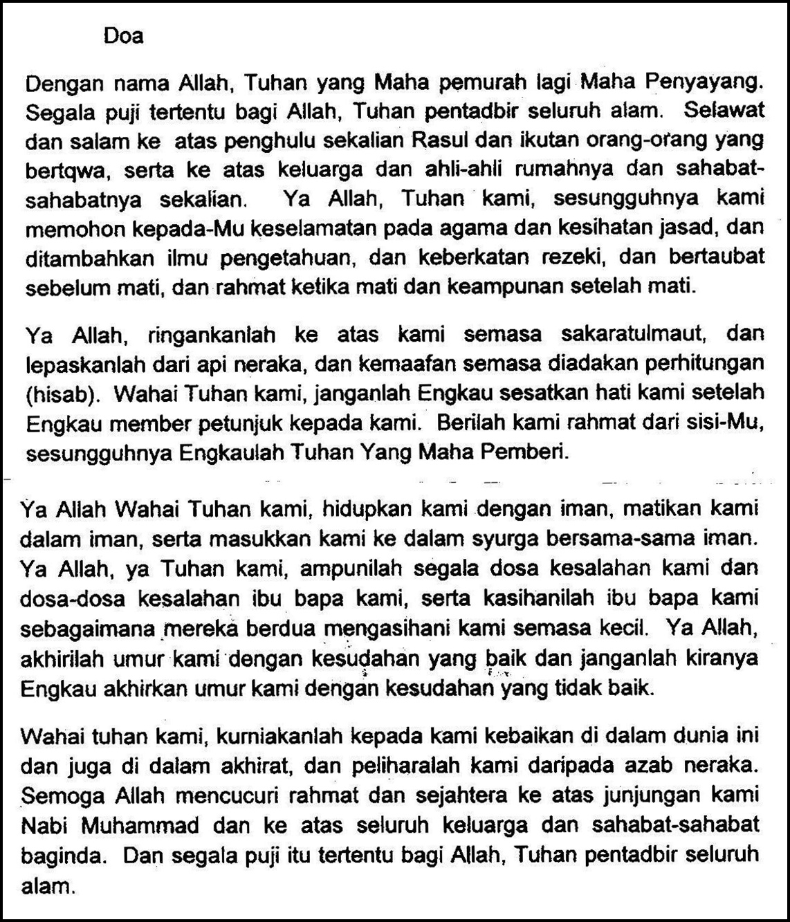 Doa selepas solat dalam rumi dan arab. Membaca sebanyak 10 kali, dalam keadaan masih duduk tahiyat akhir. Afdalnya 1/3 malam atau perkiraan jam 3 pagi. Doa setelah sholat menjadi amalan yang dianjurkan untuk dilakukan orang islam setelah melaksanakan sholat agar allah mengabulkan doa yang kita panjatkan.