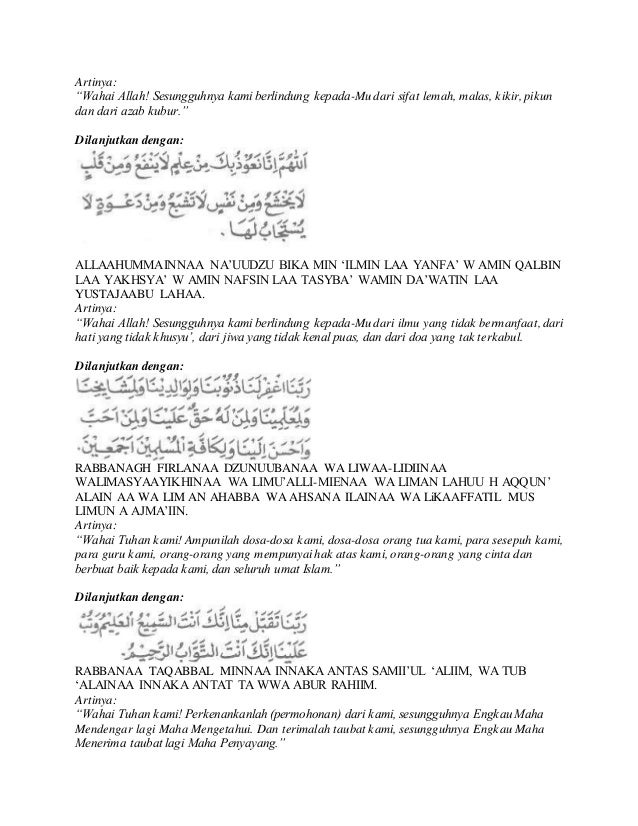Menyesal atas perbuatan yang telah dilakukan dan berniat tidak akan melakukannya lagi disertai permohonan ampun. A'uudzu billaahiminasy syaitoonirrojiim, bismillaahirrohmaanirrohiim doa yang berikutnya. Baca doa dzikir setelah sholat 5 waktu 1. Sholat taubat nasuha, tata cara, waktu, niat dan doanya di tulis dalam bahasa arab, latin dan terjemah agar mudah di pahami.