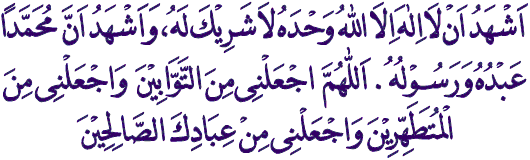 Waj alnii minal mutathohiirina waj alnii min 'ibadatishalihin. Wa asyhadu anna muhammadan 'abduhu wa rasuuluh. Do'a sesudah wudhu :asyhadu allaa ilaaha illallah wahdahu laa syariikalahu.
