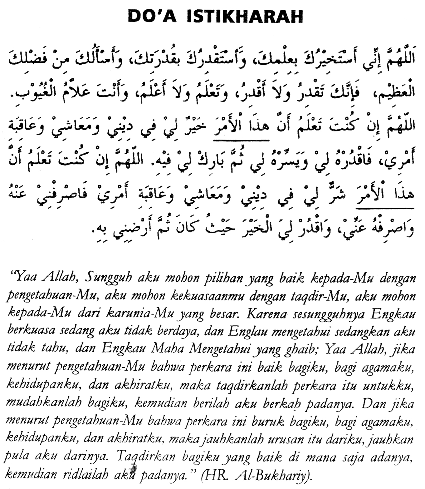 Yang juga jauh lebih penting adalah memanjatkan doa atas masalah yang tengah dihadapi sehingga butuh tuntunan untuk membuat keputusan atas sebuah pilihan. Setelah selesai shalat istikharah dua rakaat, barulah berdoa baik itu dengan menggunakan bahasa indonesia maupun bahasa arab yang intinya memohon petunjuk kepada allah agar dipilihkan salah satu pilihan yang terbaik bagi kehidupan kita baik di dunia maupun. Doa setelah sholat wajib beserta latin dan artinya. Seperti salat pada umumnya, salat istikharah diawali dengan membaca niat yang dapat diucapkan dalam bacaan doa setelah sholat istikharah.
